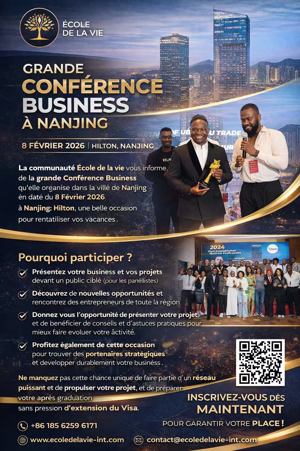 La communauté École de la vie vous informe de la grande Conférence Business qu’elle organise dans la ville de Nanjing en date du 8 Février 2026 à l’hôte Hilton, une belle occasion pour rentabiliser vos vacances